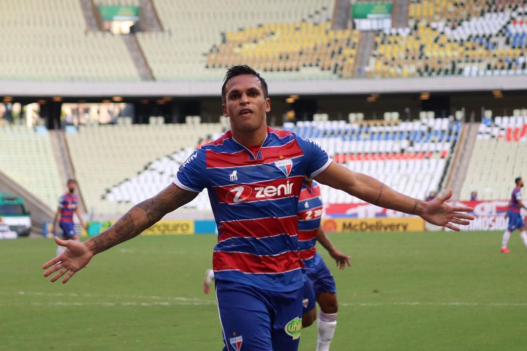 | A comemoração de Robson, um dos autores da goleada do Fortaleza no Internacional. (Foto: Leonardo Moreira/FEC) |